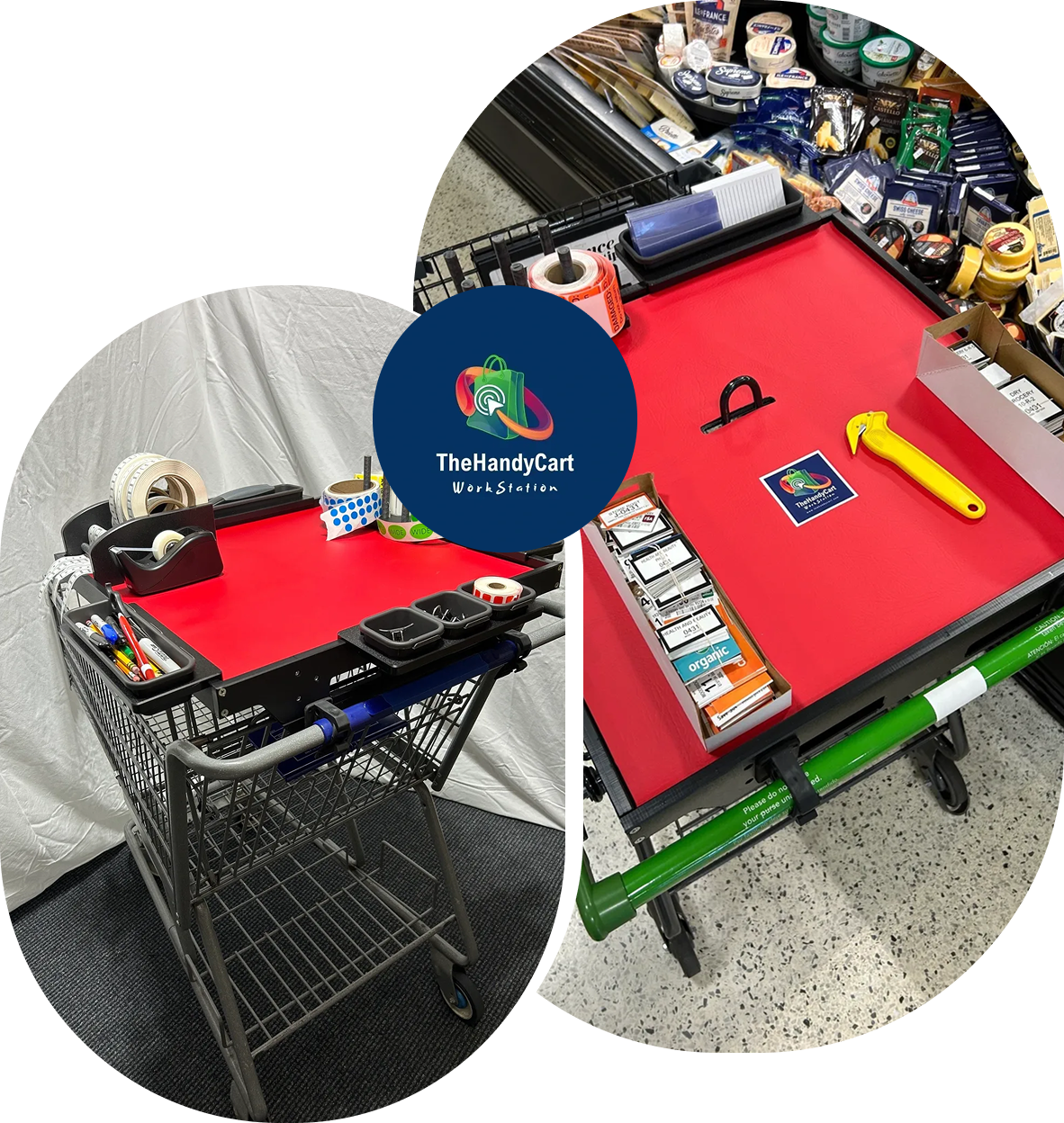 The HandyCart Workstation™ is a mobile, multi-purpose workstation designed for retailers, merchandisers, and store teams. It keeps price labels, signage, tools, scanners, and supplies organized in one place, making in-aisle work faster and more efficient.